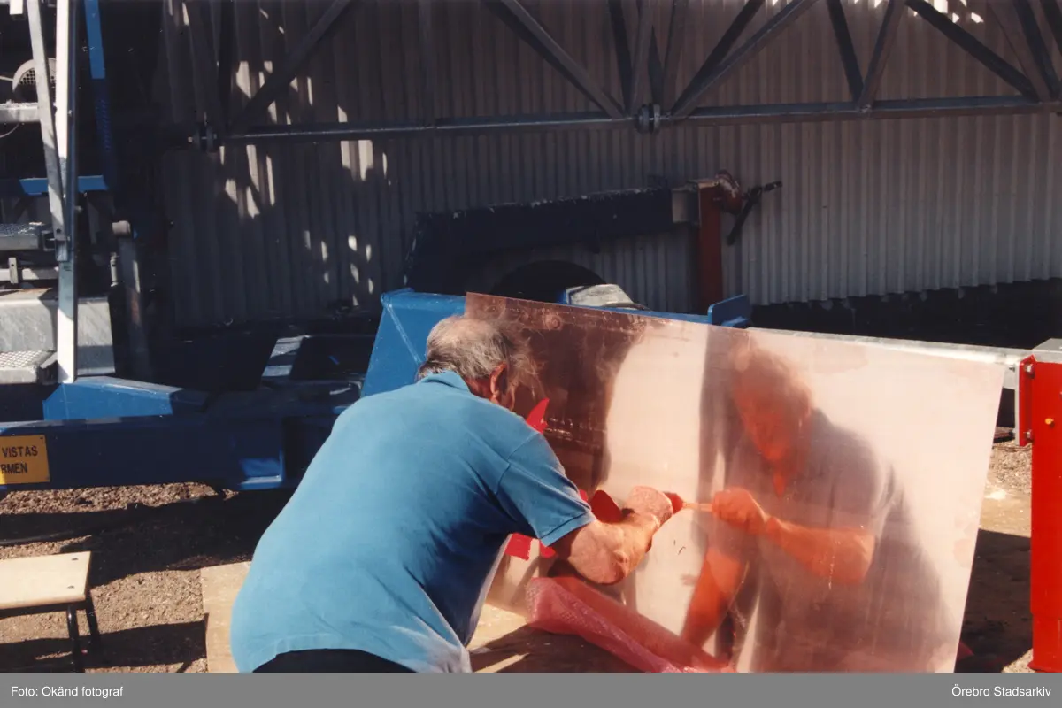 Konstnären Bengt Lindström signerar sitt verk vid invigningen, 1999-06-02