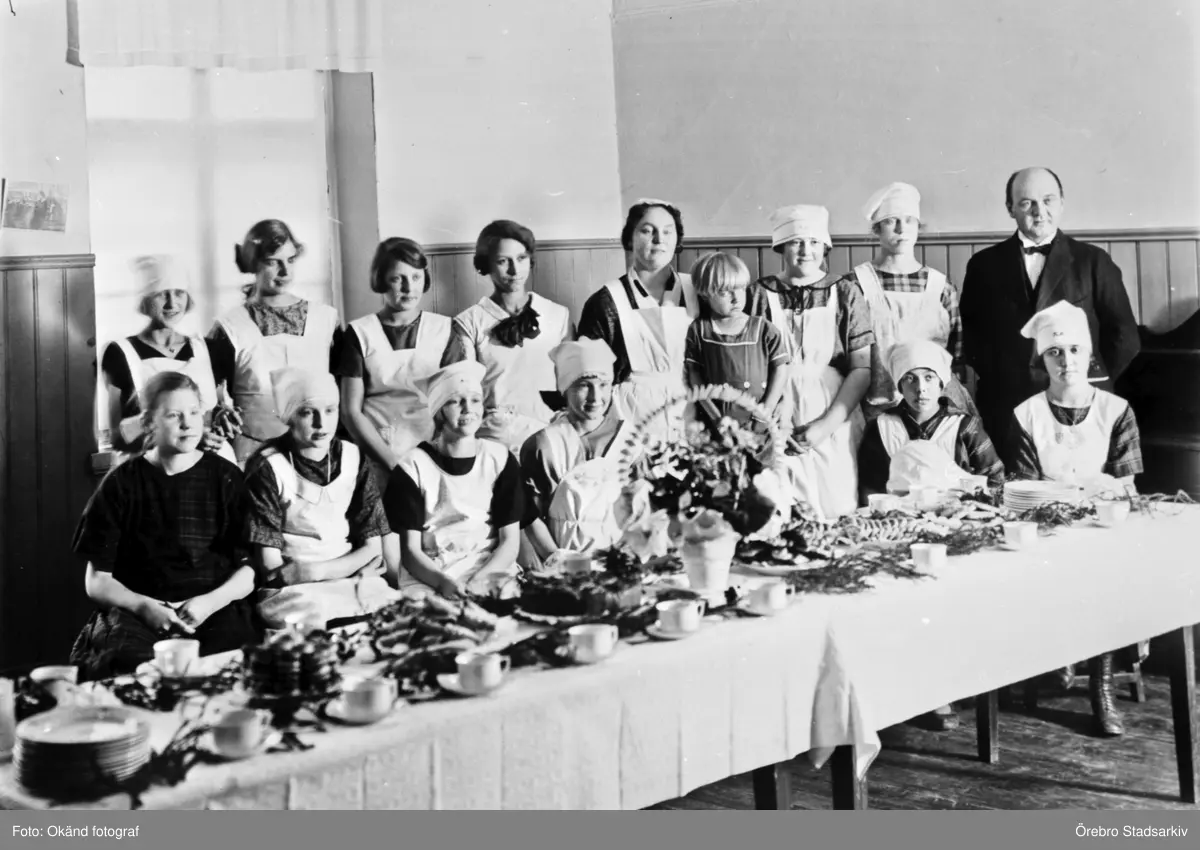 Elever i skolköksundervisning med rektor Andersen, 1930-tal