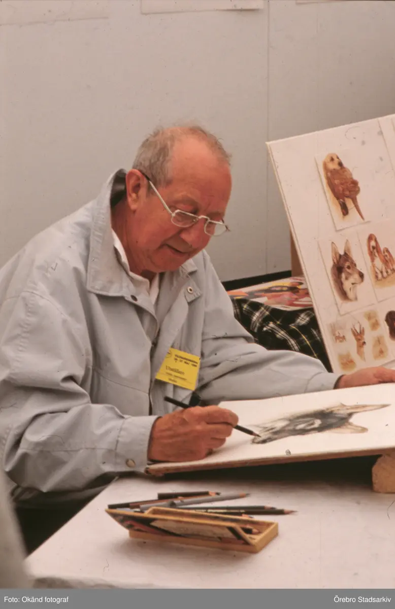 Konstnär ritar och målar hundmotiv på Vildmarksmässan i Ånnaboda, maj 1991