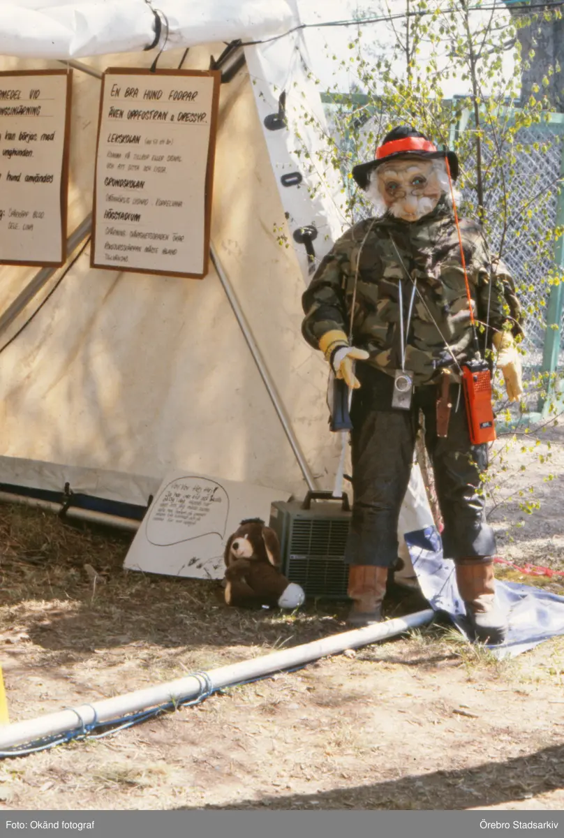 Reklamdocka klädd i kamouflagekläder på Vildmarksmässan i Ånnaboda, maj 1991