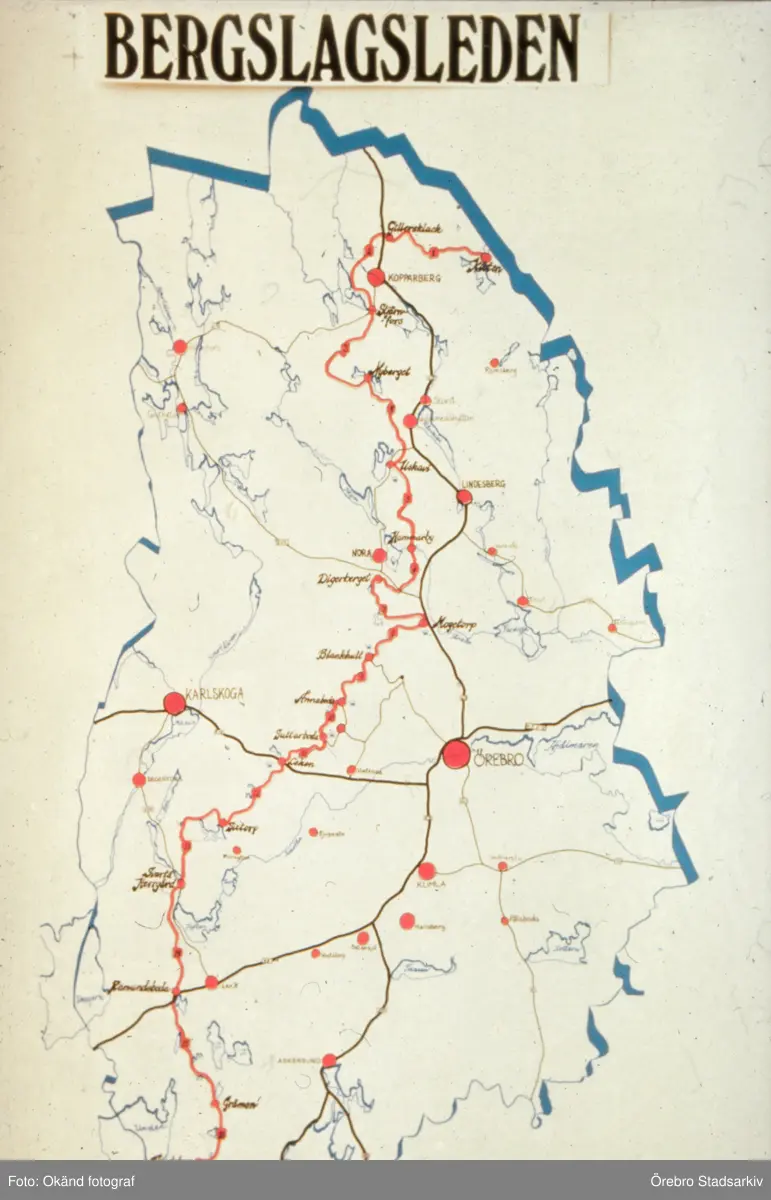 Karta över Bergslagsleden från Kloten i norr till Stenkällegården i söder, 1970-tal
