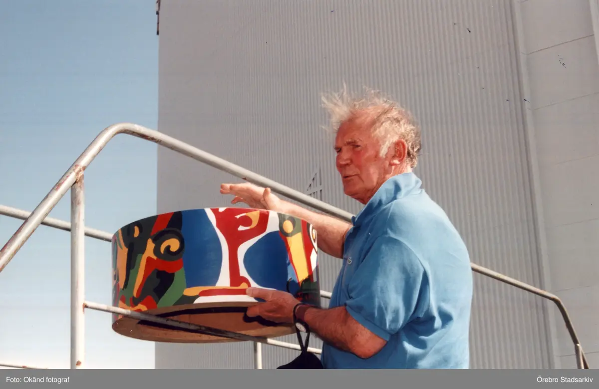 Titel: Konstnären Bengt Lindström med modell av oljetank vid invigningen, 1999-06-02