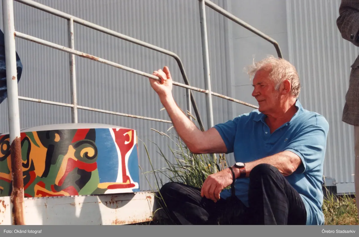 Konstnären Bengt Lindström med målad modell av oljetank vid invigningen, 1999-06-02
