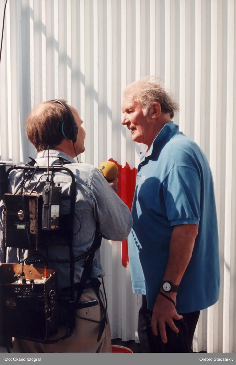 Konstnären Bengt Lindström blir intervjuad vid invigning av oljetanken., 1999-06-02