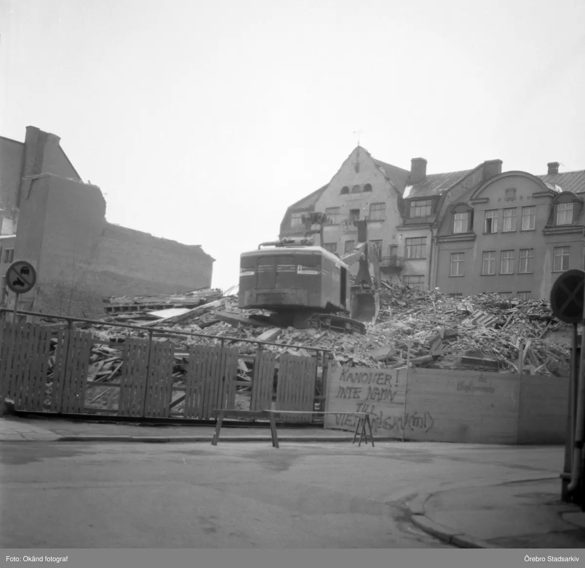 Grävmaskin river fastighet på Fredsgatan, mars 1973