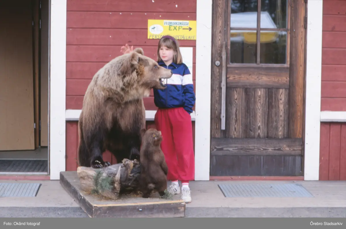 Flicka tittar intresserat på en uppstoppad björn med unge Vildmarksmässan i Ånnaboda, maj 1991