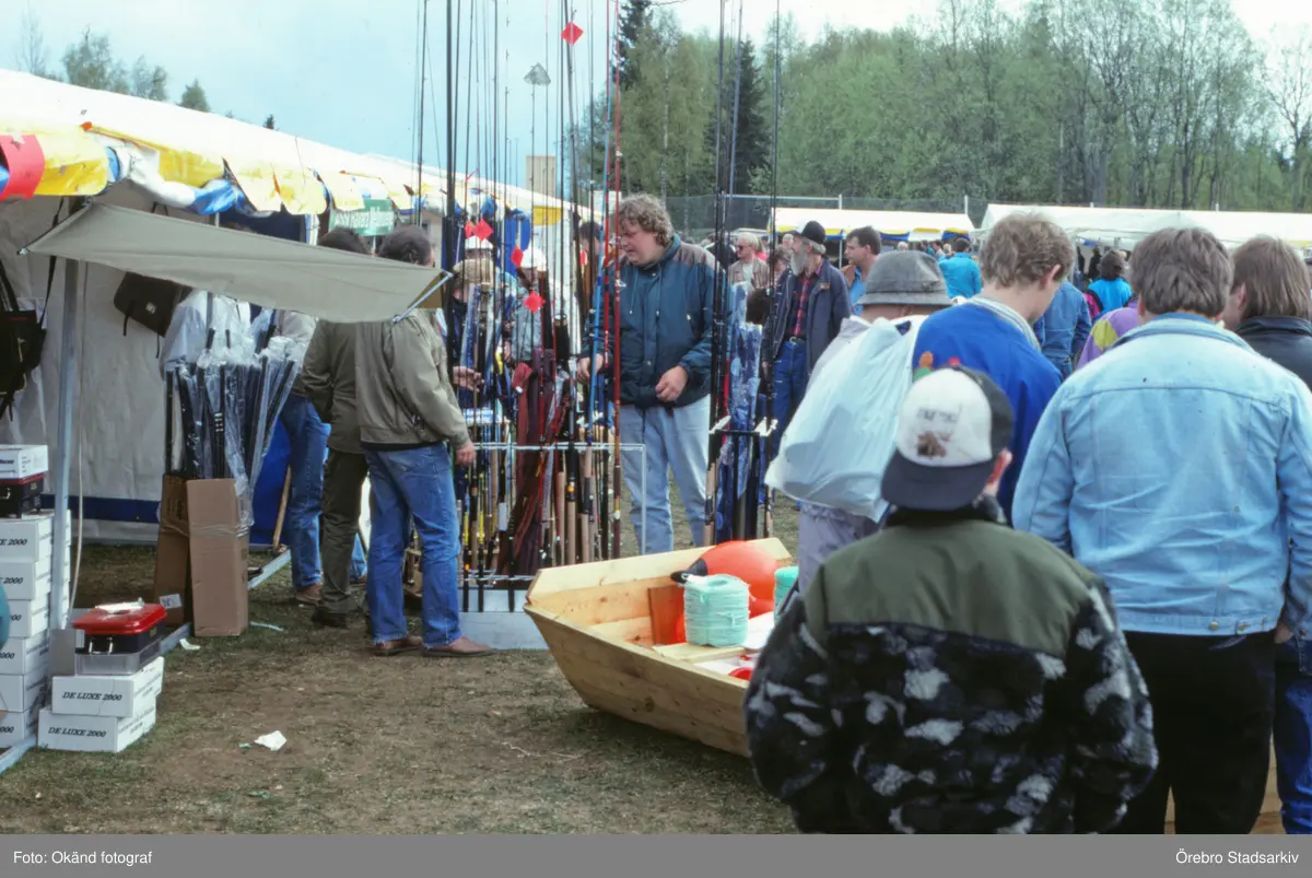 Många besökare vid fiskeståndet på Vildmarksmässan i Ånnaboda, maj 1991
