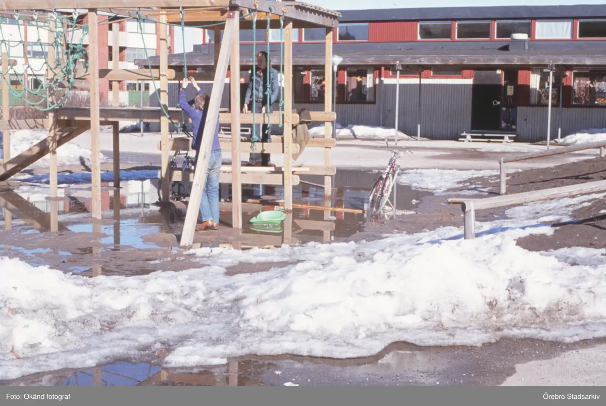 Två barn leker i klätterställning på Varbergaskolans lekplats, 1980-tal