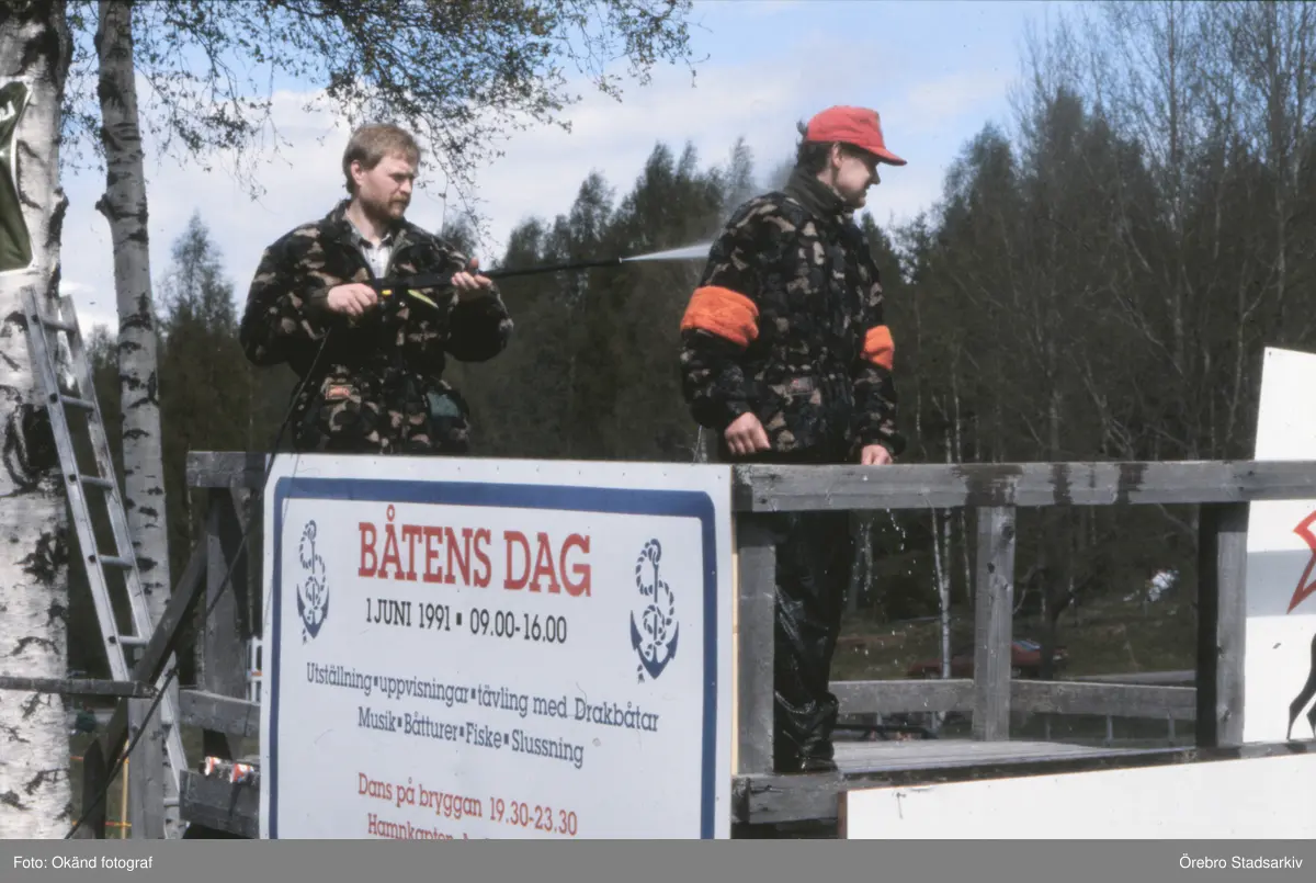 Två män vid informationsskylt på Båtens dag, Örebro I juni 1991