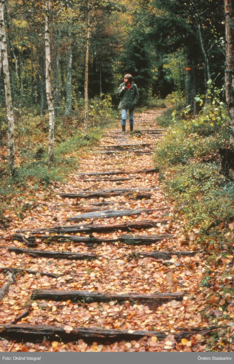 Man med ryggsäck går i timmertrappa på en etapp längs med Bergslagsleden, 1980-tal