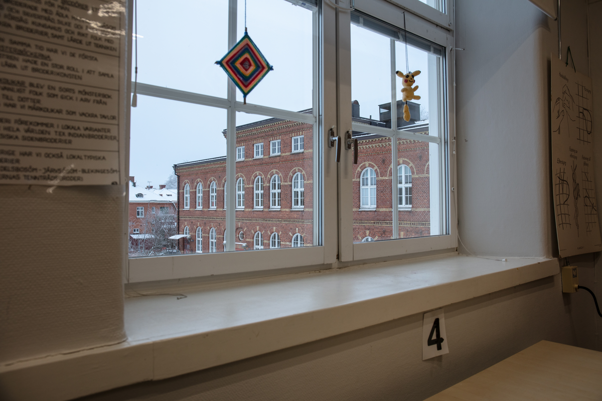 Vänersborg, Norra skolan. Utsikt från slöjdsal, textilslöjd