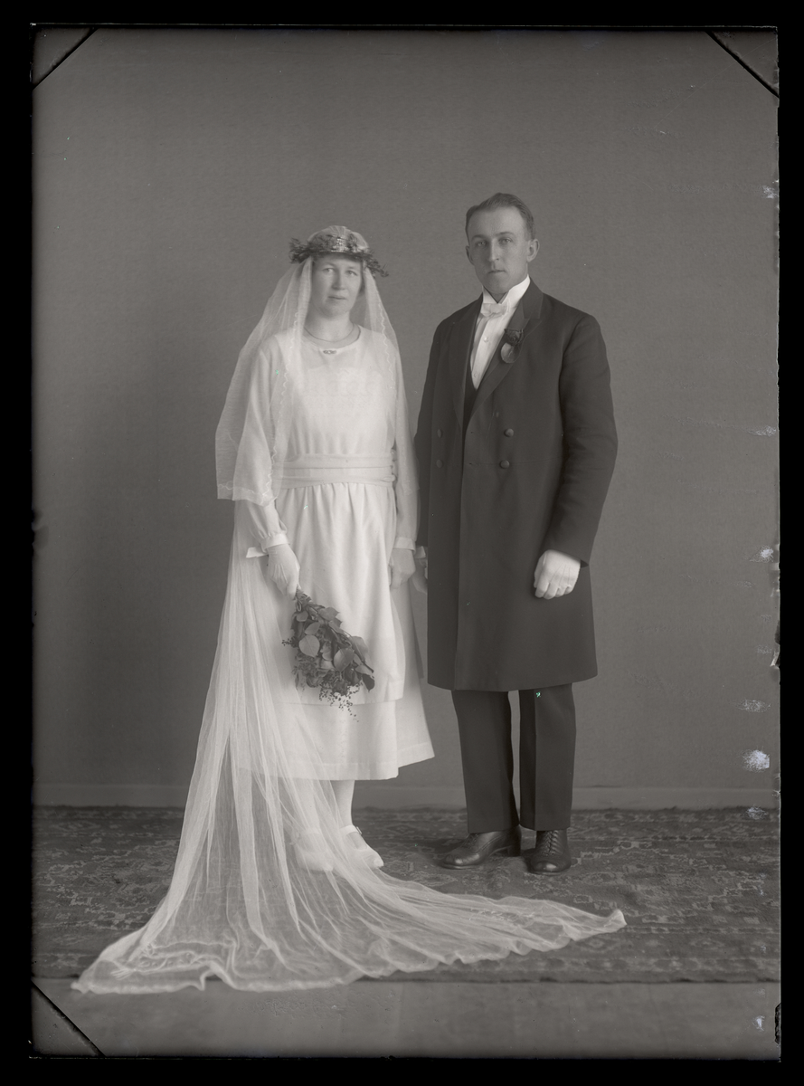 Titel: Brudpar, Sköld Joh. , Tomtebo, ( Forsling ), Hallstahammar. Ur Gustaf Åhmans samling.