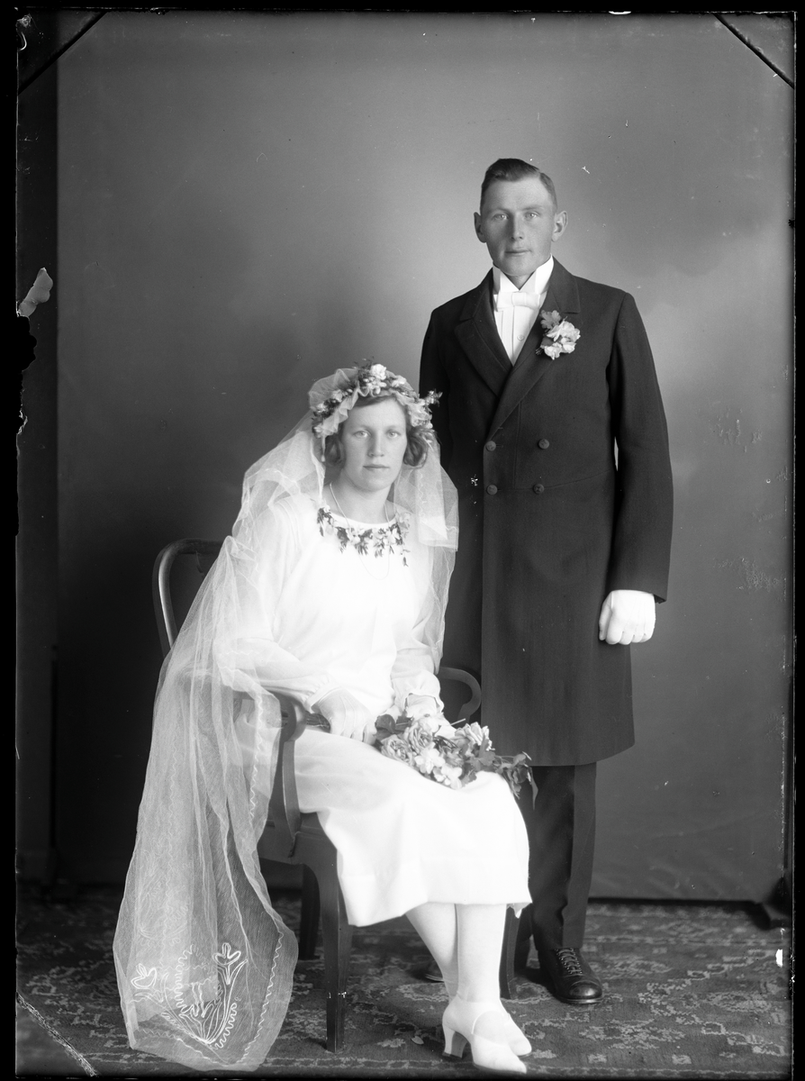 Titel: Grupporträtt, brudpar, Allan Andersson, Norrby, Berg. Ur Gustaf Åhmans samling.