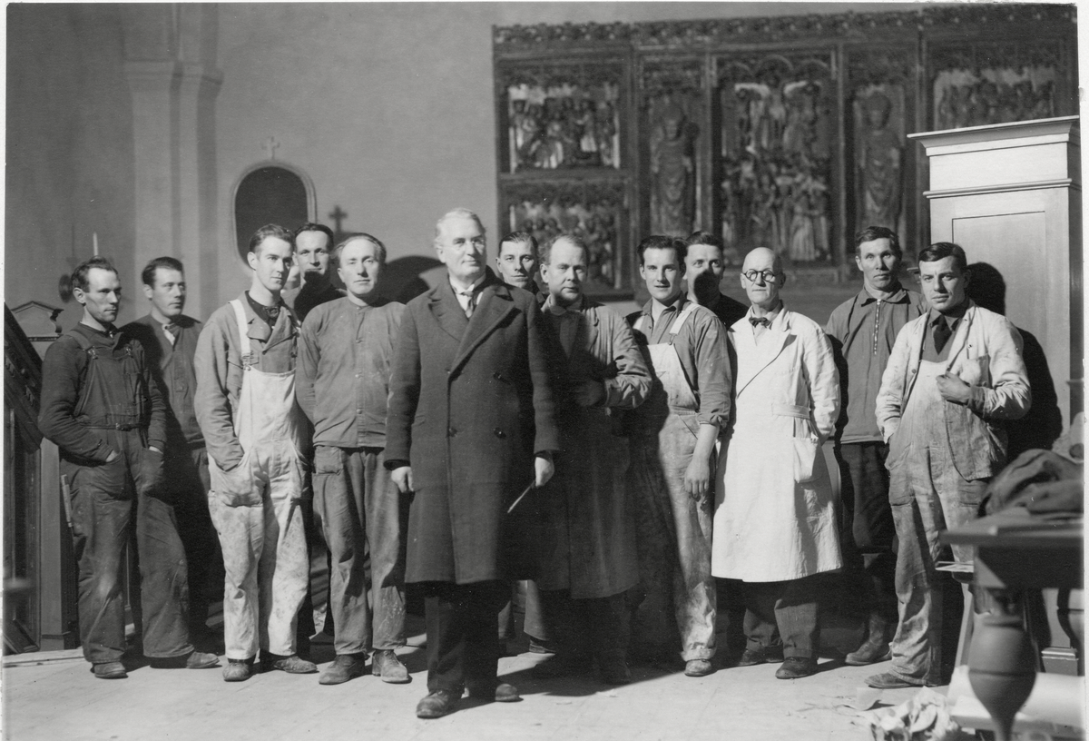 Arbetare m.fl. vid renoveringen av Kila kyrka.