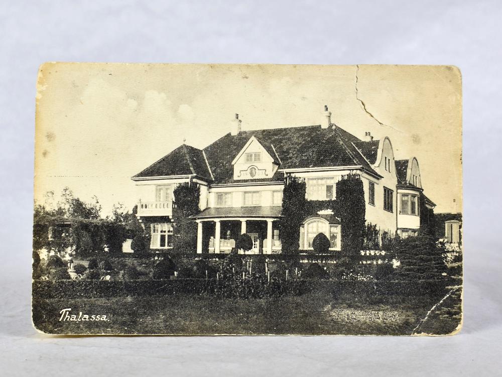 Svartvitt vykort med fotografi av Villa Thalassa. Bilden är tagen under tidigt 1900-tal. Villan ses från väst och man ser en stor del av trädgården. På baksidan har "Helga" skrivit till faster "Bothilda", skrivet med svart bläck.