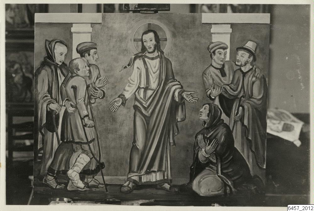 Bilden visar en målning av en biblisk scen där Jesus botar sjuka.