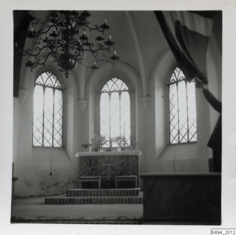 Bilden visar en interiör från okänd kyrka. Altare med altarduk, två trappsteg upp till altaret. Längst fram vid altaret tre fönster. I bildens ovankant en ljuskrona till vänster och Sveriges flagga till höger.