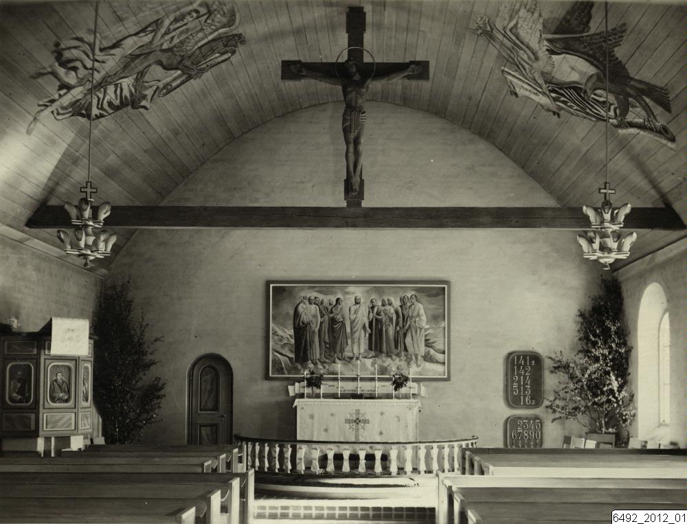 Bilden visar en interiör från okänd kyrka. Altare med altartavla, altarduk och altarring. Till vänster om altaret en dörr, och till höger två tavlor med psalmnummer. I de två hörnen på bilden finns stora björkris. Välvt tak av trä med stora målningar. Ett stort krucifix som hänger ner från taket. Kyrkbänkar i förgrunden och en predikstol till vänster, samt ett fönster till höger.