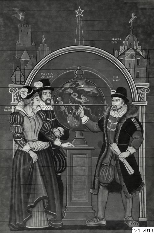 Målningen föreställer Jacob av Skottland på besök hos Tycho Brahe.