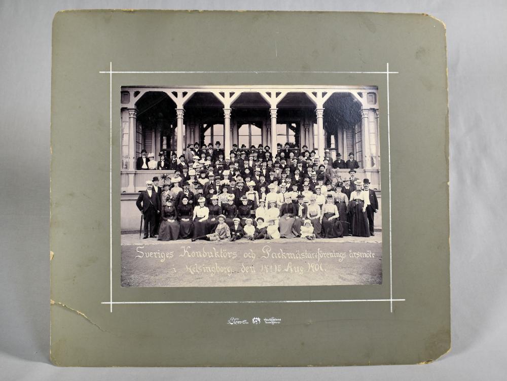 Svartvitt fotografi limmat på grön/grå papp. Fotografiet ser inramat ut genom vitt tryck runt bilden. Under bilden är tre föreningsmärken tryckta i samma vita färg. Fotografiet föreställer ett grupporträtt av deltagare, med familjer, vid Sveriges konduktörs- och packmästareförenings årsmöte som hölls i Helsingborg 1901-08-14 - 1901-08-15. Bilden är tagen utomhus framför en träbyggnad med stora spröjsade glasfönster och en stor veranda med tillhörande trappa. Personerna sitter och står i flera rader. Längst fram på marken sitter en samling barn. Under barnen har man tryckt "Sveriges Konduktörs- och Packmästareförenings årsmöte i Helsingborg den 14 & 15 Aug. 1901" i vitt. En av personerna på bilden är Gustaf Bernhard Holmberg (1875-1959).