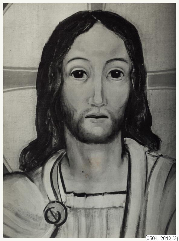 Bilden visar en detalj av altarskåpet i Södra Sallerups kyrka, målat av Hugo Gehlin. Motivet är Jesu huvud.