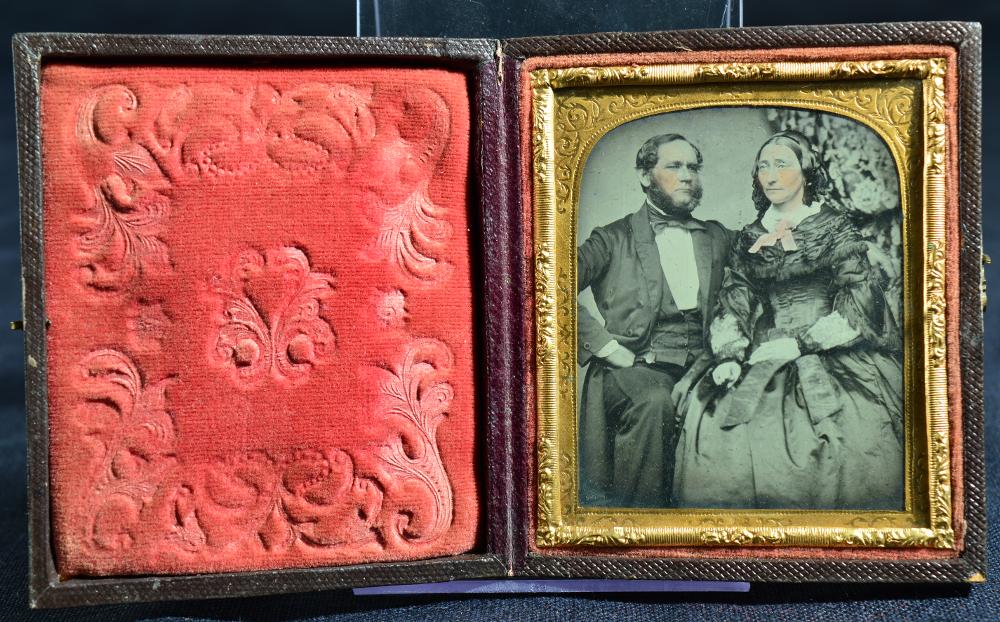 Svartvitt fotografi, ambrotyp, porträtt av en sittande par i halvprofil. Draperi i bakgrunden. Passepartout i gulmetall med växtornamentik. Monterad i etui med rödaktigt mönstrat sammetstyg på insidan av locket. Grönt läder med växtornamentik på framsidan samt rygg i rött läder. Knäppes med hasp i metall.