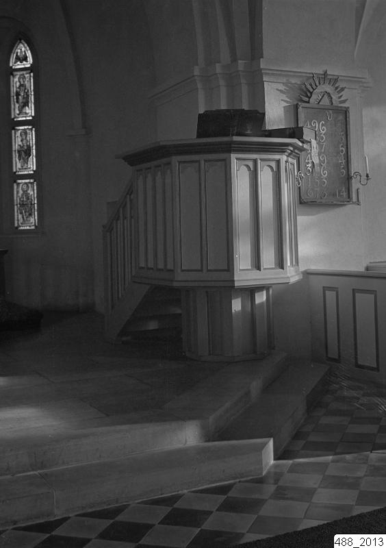 Bilden visar en interiör i Södra Sallerups kyrka. I förgrunden dopfunten och i bakgrunden glasmålning av Hugo Gehlin.