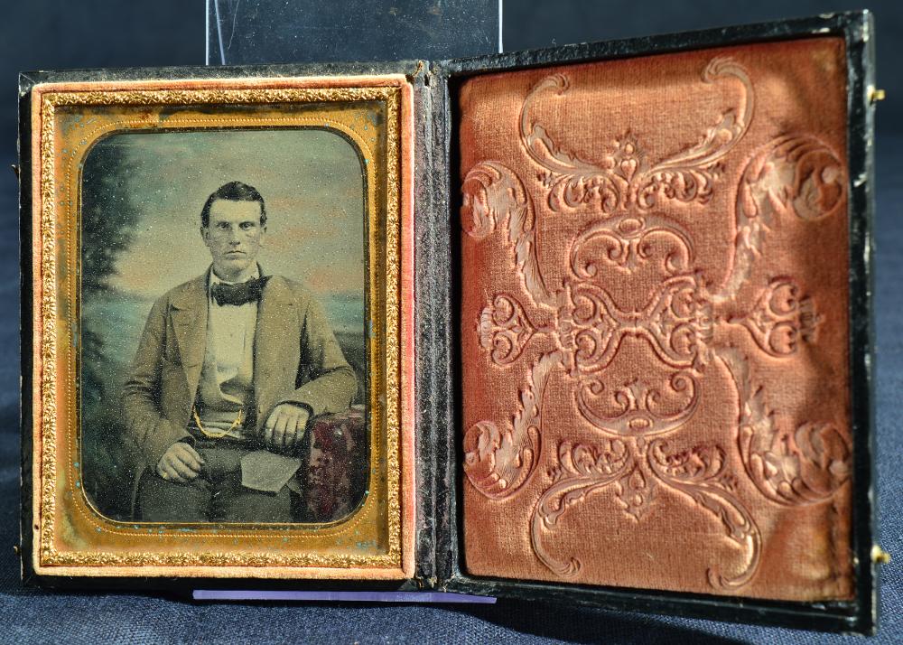 Svartvitt fotografi, kolorerad ambrotyp, porträtt av en sittande herre, enface. Landskap i bakgrunden. Passepartout i gulmetall med växtornamentik. Guldlist längs kanten. Monterad i etui med rött mönstrat sammetstyg på insidan av locket. Svart läder med växtornamentik på framsidan. Knäppes med två haspar i metall.