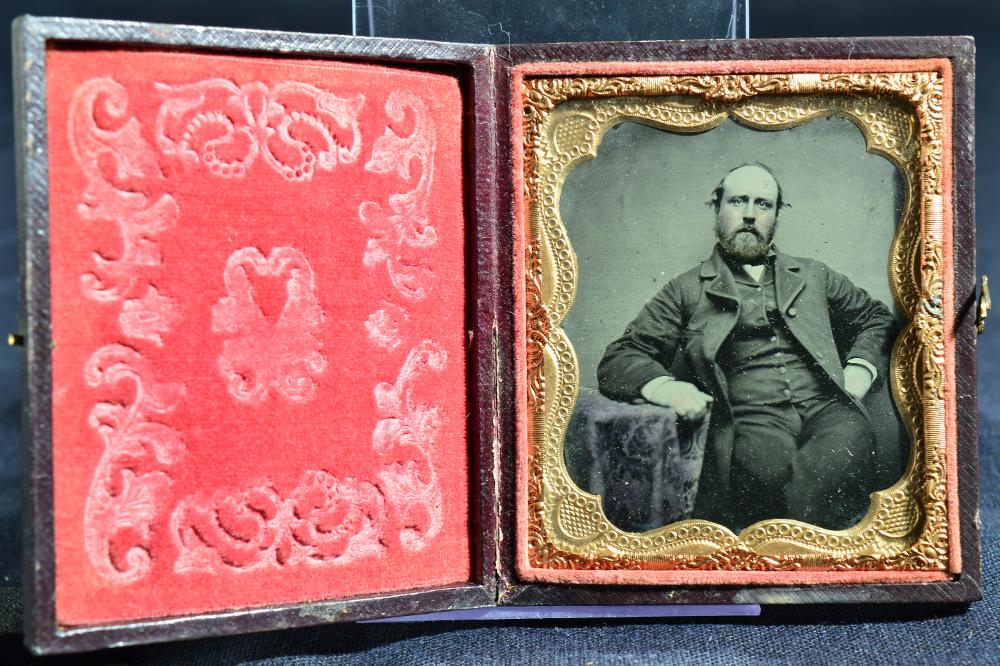 Svartvitt fotografi, ambrotyp, porträtt av en sittande herre med höger arm över ett bord i halvprofil, enface. Passepartout i gulmetall med växtornamentik. Monterad i etui med rödaktigt mönstrat sammetstyg på insidan av locket. Brunaktigt läder med växtornamentik på framsidan. Knäppes med hasp i metall.