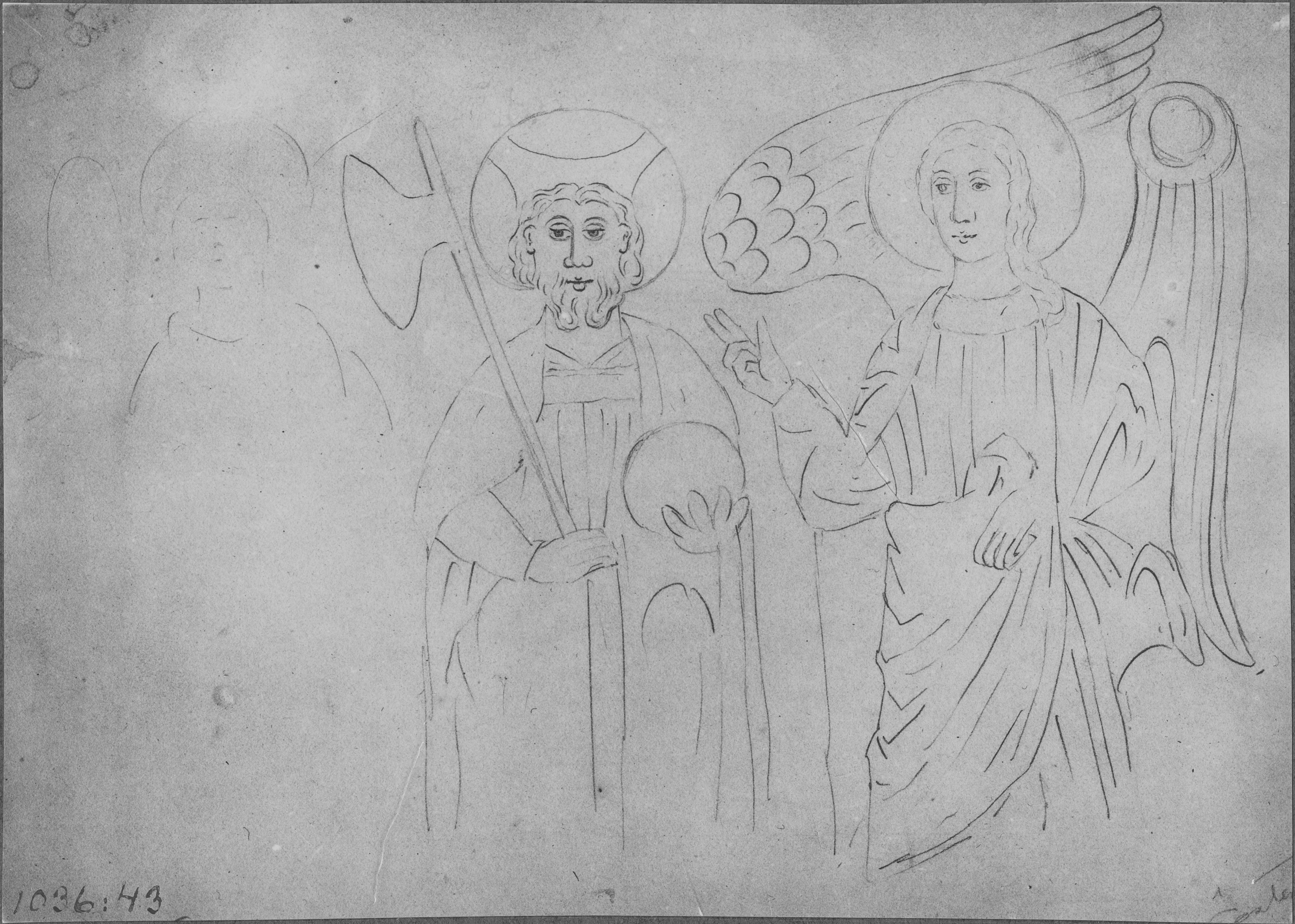 Beskrivning: Kalkmålning, romansk, föreställande en "sköna ängeln". Efter teckning av C.F. Lindberg? i ATA.