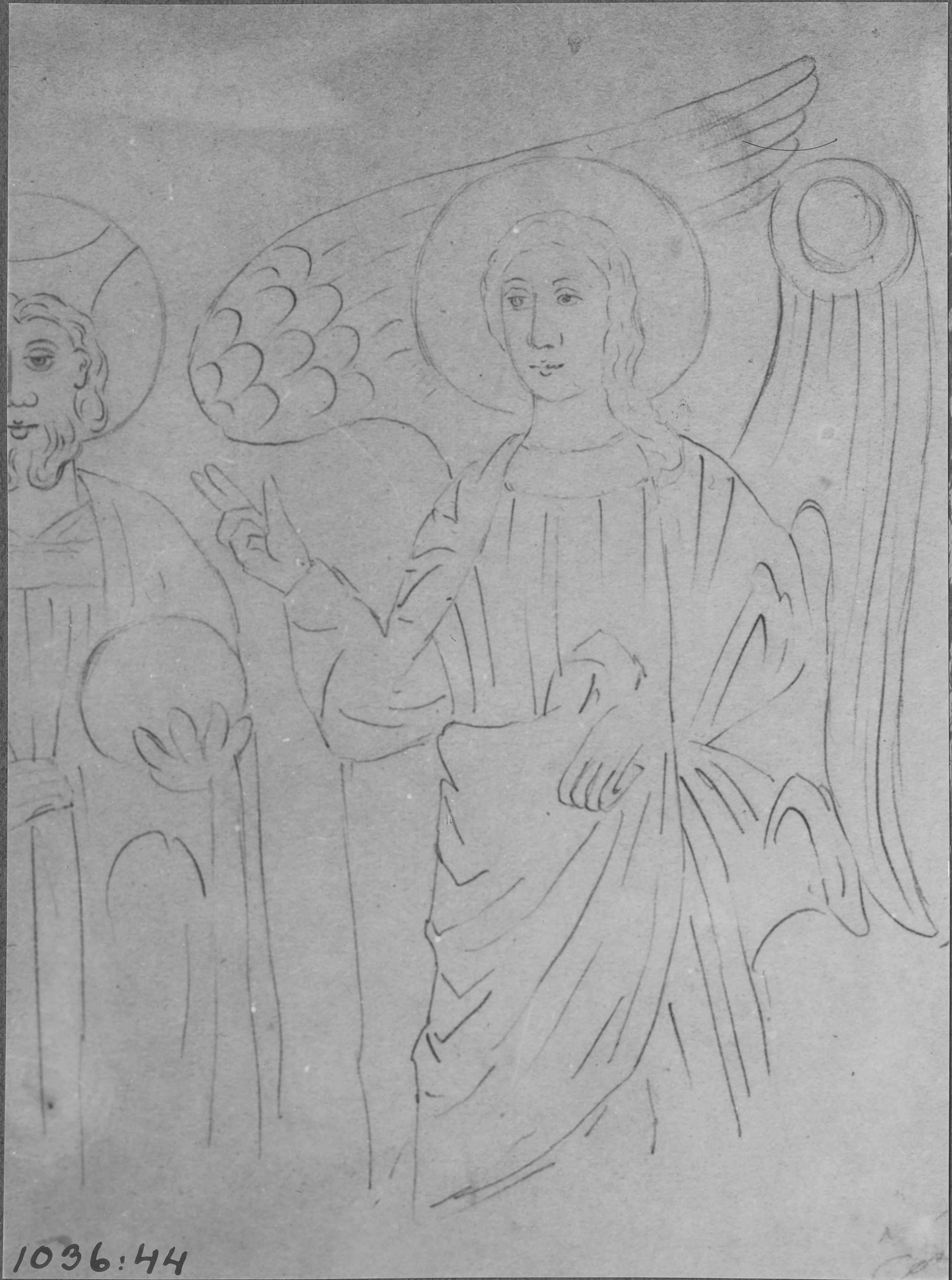 Beskrivning: Kalkmålning, romansk, föreställande en "sköna ängeln". Efter teckning av C.F. Lindberg? i ATA.