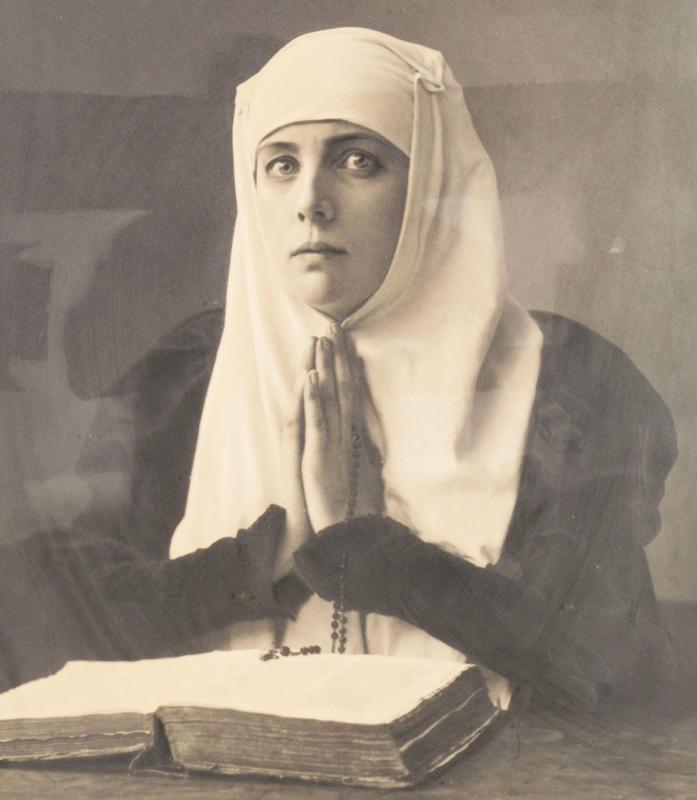 Svartvitt fotografi inom glas och ram föreställande en nunna som sitter med knäppta händer framför en uppslagen bok.