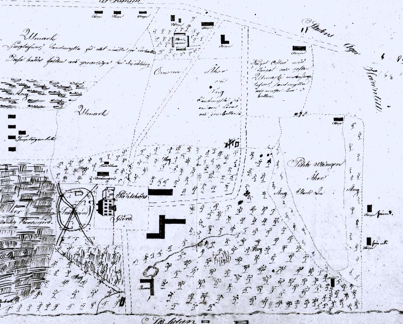 Svartvitt fotografi av en karta över Pålsjö gård, Helsingborg,från 1794?.