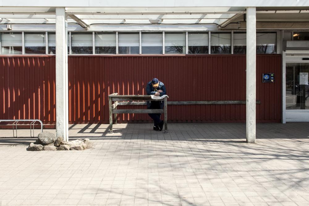 Bilden är tagen utanför matvarubutiken ICA Nära Drottninghög. En man står utanför och läser en tidning.