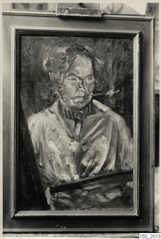 Bilden visar en stafflimålning, Målarinna i aktivitet 1927, av Hugo Gehlin. Porträtt av Esther Gehlin i arbete.