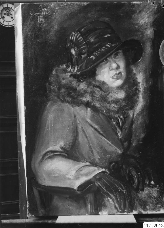 Bilden visar en stafflimålning, Kallt 1925, av Hugo Gehlin. Porträtt av sittande kvinna, klädd i pälsboa, hatt och handskar.