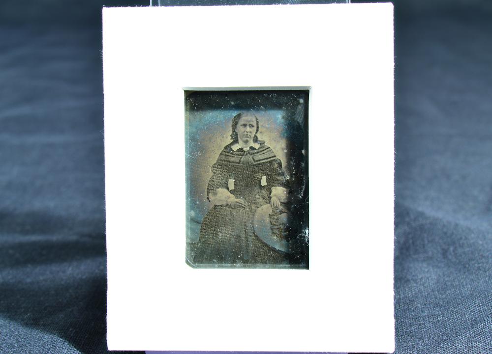 Svartvitt fotografi, daguerreotyp, föreställande ung kvinna med hatt. Monterad inom passepartout med gulddekor och svartmålat glas med guldlinjedekor. Bakstycke i grått papper. Metallögla för upphängning. På baksidan text på pappersetikett: " J. F. Dabelsteen, Photograph."