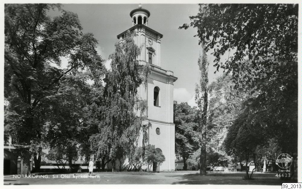 Bilden visar S:t Olai kyrkas torn i Norrköping, omgivet av träd.
