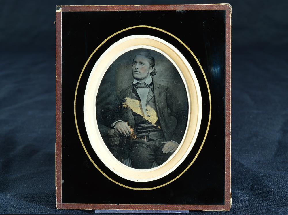 Svartvitt foto, ambrotyp, föreställande Frans Joseph Jepsson, sittande i halvprofil. Monterad med passepartout i svartmålat papper med guld. Glasad och ihopmonterad med brunt papper längs kanterna. Brunt papper som bakstycke och metallögla för upphägning. Lapp på baksidan med text: " Sedermera hamnkaptenen i Hälsingborg. Frans Joseph Jepson som 18-årig yngling. "