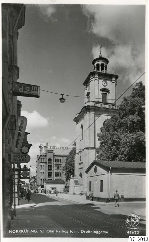 Bilden visar Drottninggatan i Norrköping med S:t Olai kyrkas torn till höger.