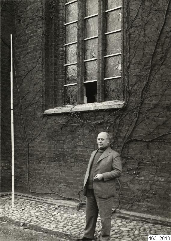 Bilden visar Hugo Gehlin utanför S:t Petri kyrka. Han står nedanför Petrifönstret.