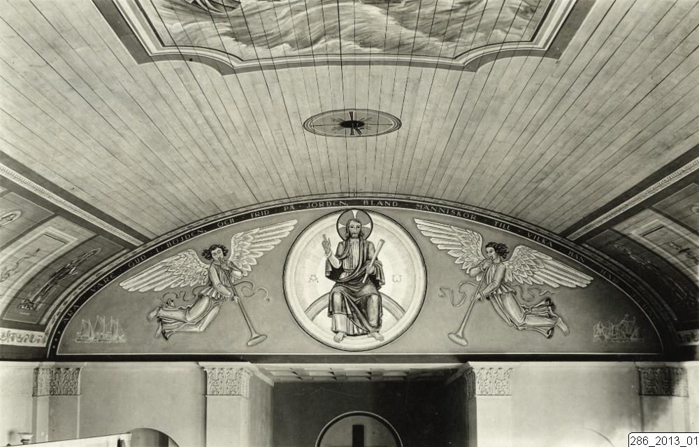 Bilden visar en takmålning i Allhelgonakyrkan på Råå i Helsingborg, av Hugo Gehlin.