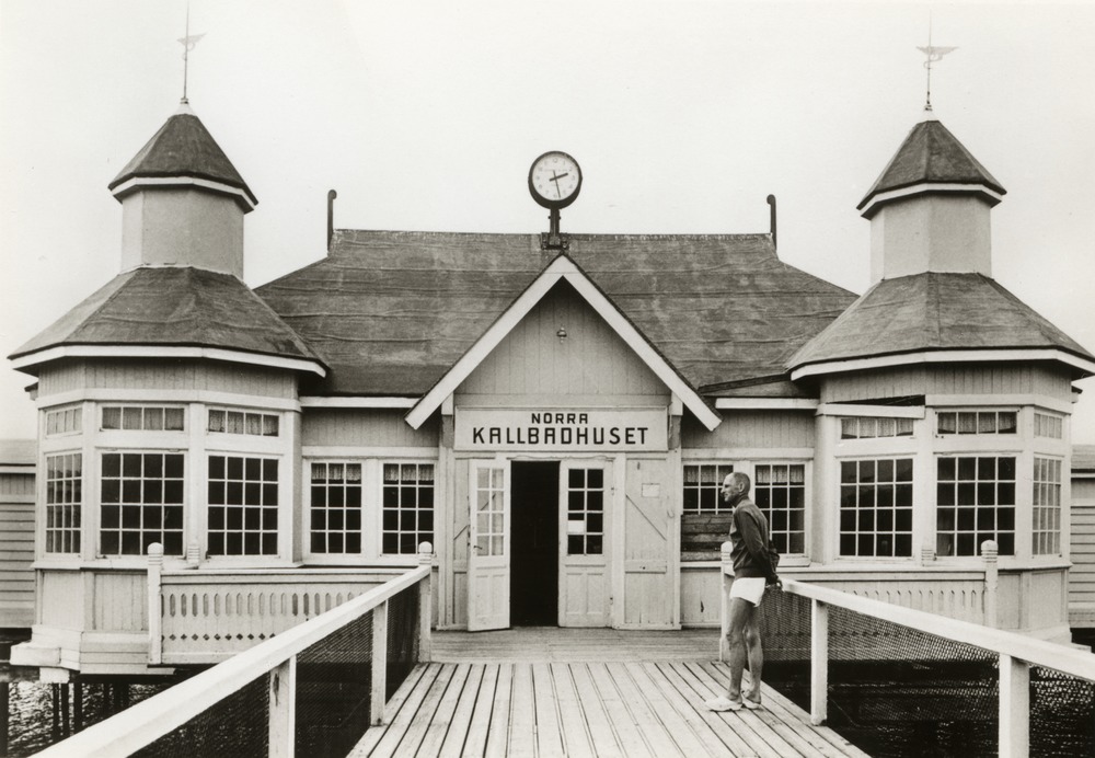 Svartvitt vykort föreställande entrén till Norra kallbadhuset på Gröningen, Helsingborg.