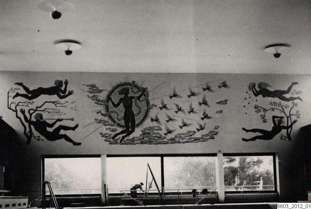 Bilden visar mosaiken Aurora och Vindarna i Trelleborgs simhall, skapad av Hugo Gehlin 1942-43. I bildens nedre del panoramafönster. En man står böjd över något framför fönstret. I bildens mitt mosaiken som täcker hela kortväggen. I taket tre lampor.