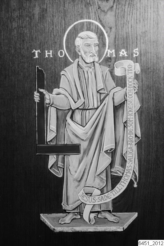 Beskrivning: Bilden visar en målning av aposteln Thomas, på en bänkskärm i Mariakyrkan, målad av Hugo Gehlin.