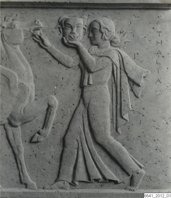 Bilden visar en detalj av en relief, De nio musernas relief, skapad av Hugo Gehlin.