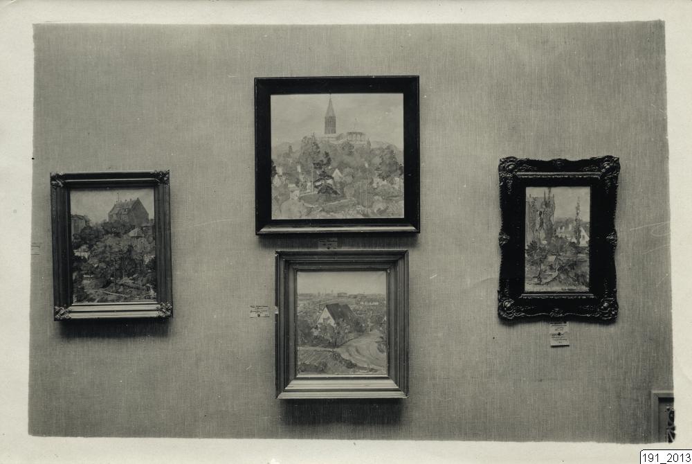 Bilden visar fyra stafflimålningar av Hugo Gehlin på en utställning.