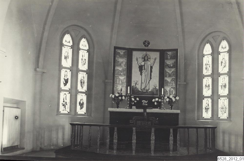 Bilden visar en interiör från Södra Sallerups kyrka. I centrum altare, altarskåp och altarring. På vardera sidan om altaret ett fönster. På altaret ljusstakar och blomvaser. Altarskåp och fönster av Hugo Gehlin.