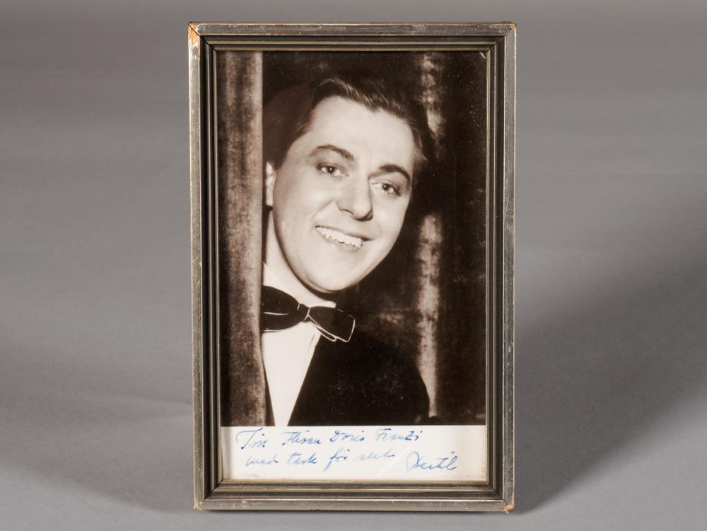 Fotografi föreställande skådespelare Bertil Norström. Porträttbild rakt framifrå. Han är iklädd kavaj, skjorta och svart fluga. På bilden har han skrivit: Till Flisan Doris Franzi med tack för allt, Bertil.