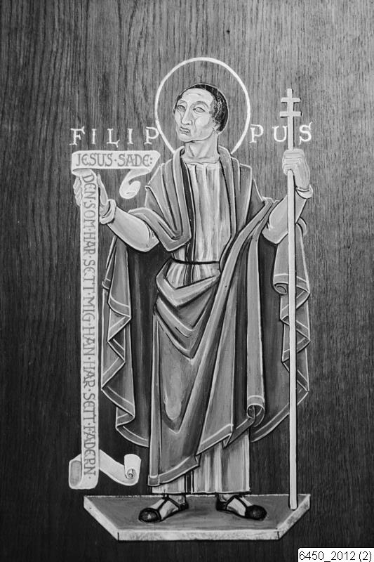 Bilden visar en målning av aposteln Filippus, på en bänkskärm i Mariakyrkan, målad av Hugo Gehlin.